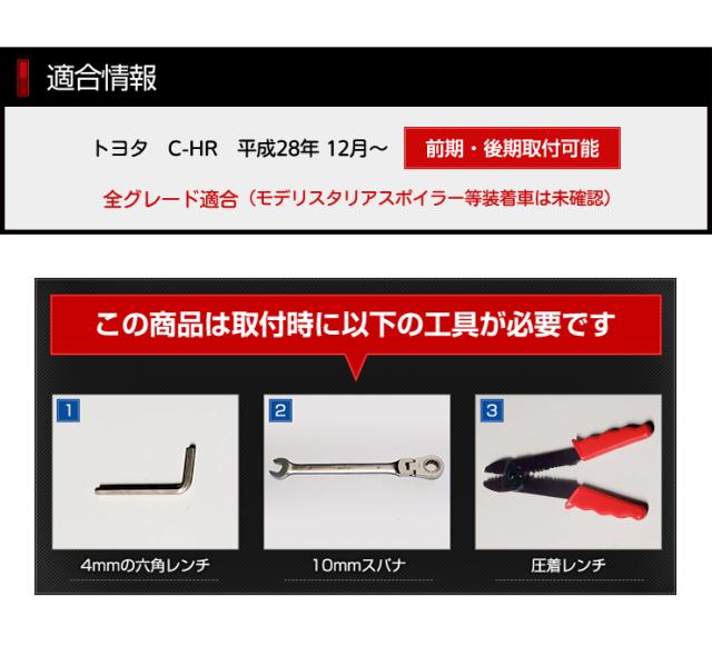 | 適合 | トヨタ C-HR 平成28年12月〜 前期・後期取付可能 全グレード ※モデリスタリアスポイラー装着車は未確認 |