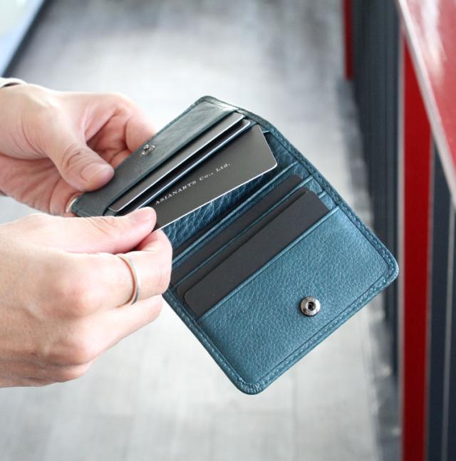 - 探していた色を見つけ即購入しました!コンパクトなのにカードも沢山入るし、お札の出し入れも大変スムーズ。このタイプの小銭入れは初なので慣れるまでは苦労しそう、でも落ちる事なくしっかりした作りなので安心。1つ気になったのが臭い…アジアンな香りがちと苦手…日本製以外を使うのが初めてなので、慣れるのが先か臭いが薄まるのが先か…。