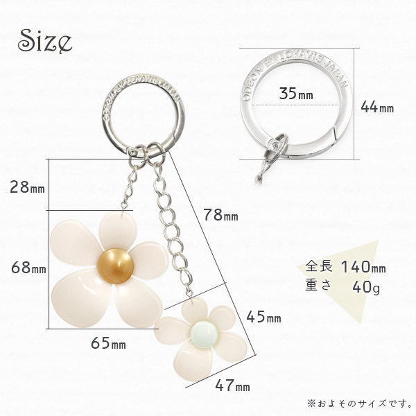 大きさが異なるプルメリアが2個付いたのバッグチャームです。