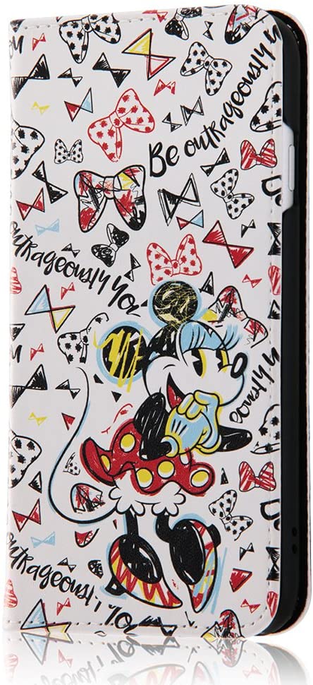 内側にはICカードポケットの付いた薄くてスリムなレザーに、ディズニーキャラクターのミニーマウスのデザインがプリントされた手帳型のiPhone SE(第2世代)/ 8 / 7用ケース※Qi充電対応