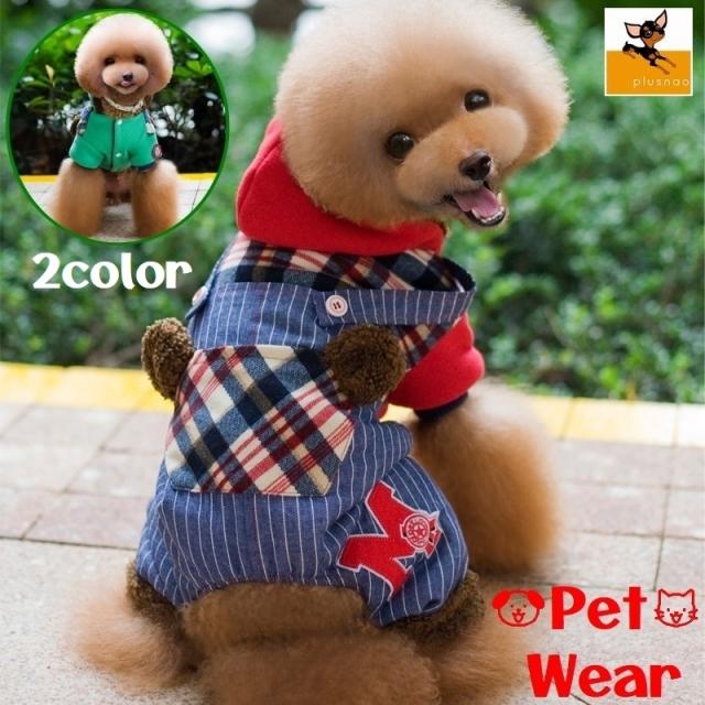 ペットウェア カバーオール つなぎ 犬服 猫服 ドッグ キャット フード付き ボタン 前開き ロゴ チェック ボア 重ね着風 暖