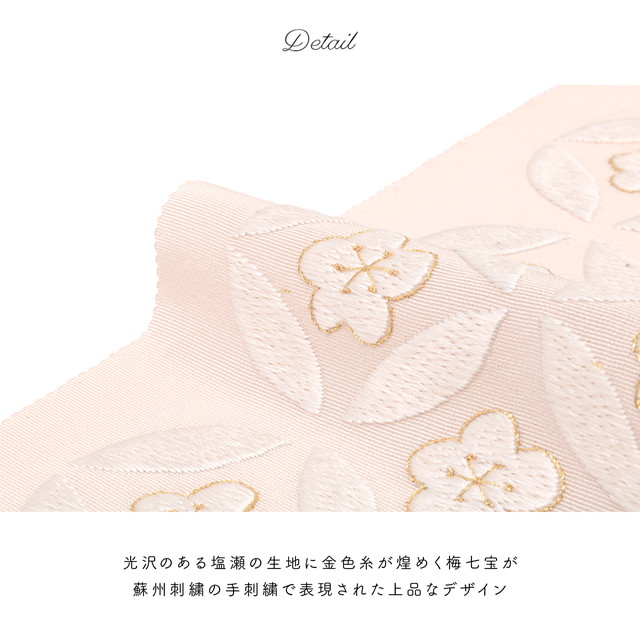 光沢のある塩瀬の生地に金色糸で縁取られた梅が煌めく梅七宝の蘇州刺繍の手刺繍で表現された上品なデザインです。