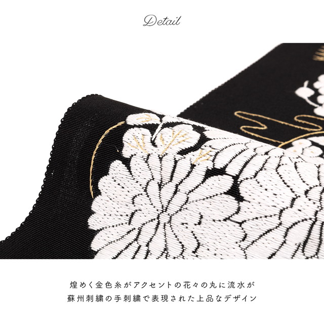 煌めく金色糸がアクセントの花々の丸に流水が、蘇州刺繍の手刺繍で表現された上品なデザインです。