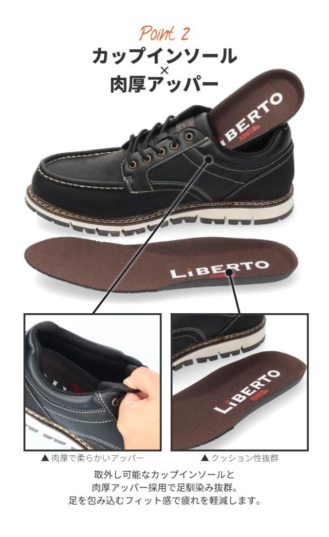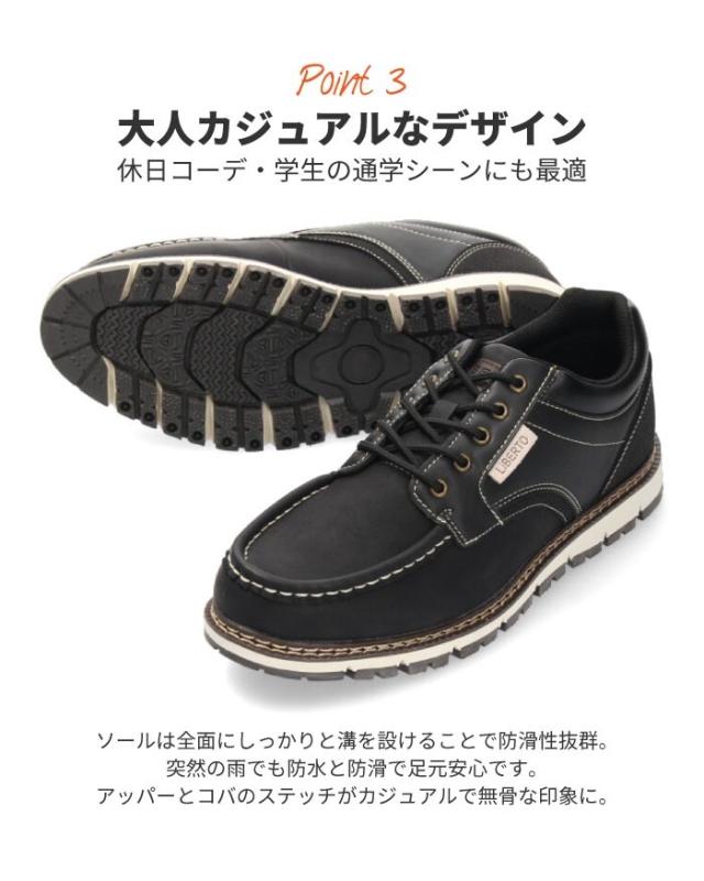 ・突然の雨でも安心!接地面から約4cm・4時間の防水設計(※完全防水ではありません)・靴内部に防水フィルム+縫製部分に防水テープ使用で水が入りにくい構造・屋内外で活躍するラバーグリップソール採用(タテ・ヨコ方向に優れた防滑性)・クッション性の高いインソールは取り外し可能・肉厚アッパーで足馴染みが良く、履き心地良好・通勤・通学・デートなど幅広いシーンにマッチするデザイン