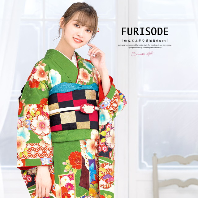 振袖セット 振袖購入 成人式 販売 日本製 8点セット 絵羽柄 緑 ピンク 桜 短冊 流水 丹後ちりめん 正絹 京友禅 西陣織 送料無料