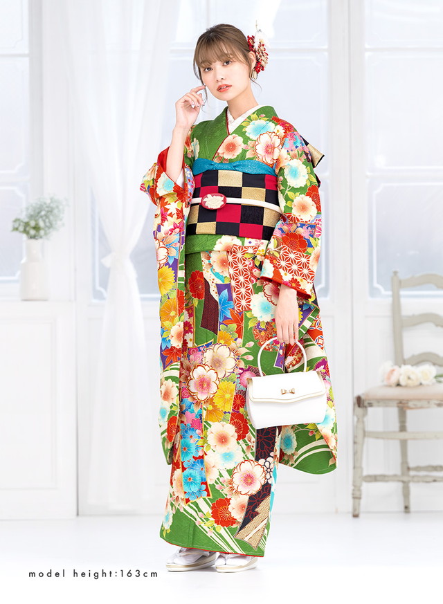 ※こちらの商品の内容は【振袖・帯・帯揚げ・伊達衿(重ね衿)・帯締め・半衿・帯留・長襦袢】の8点セットです。その他のアイテムは付属しておりません。