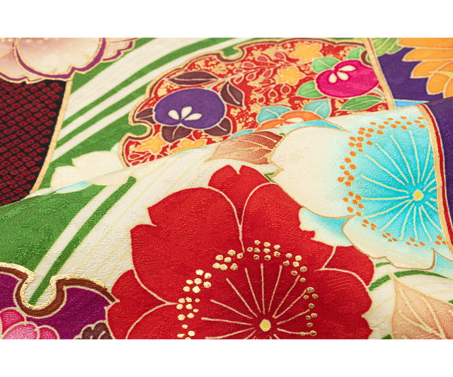 振袖は、梅紗綾型の織柄の丹後ちりめんの正絹生地に、桜や菊、牡丹などの花々や鹿の子などが配された短冊が京友禅で染め付けされた豪華な絵羽模様です。撥水効果のある「パールトーン」加工も施されています。