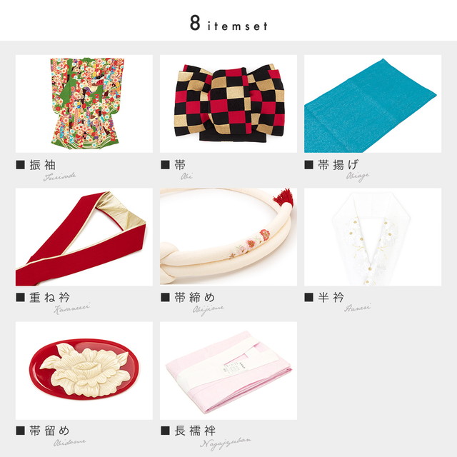 内容は【振袖・帯・帯揚げ・伊達衿(重ね衿)・帯締め・半衿・帯留・長襦袢】の8点セットです。