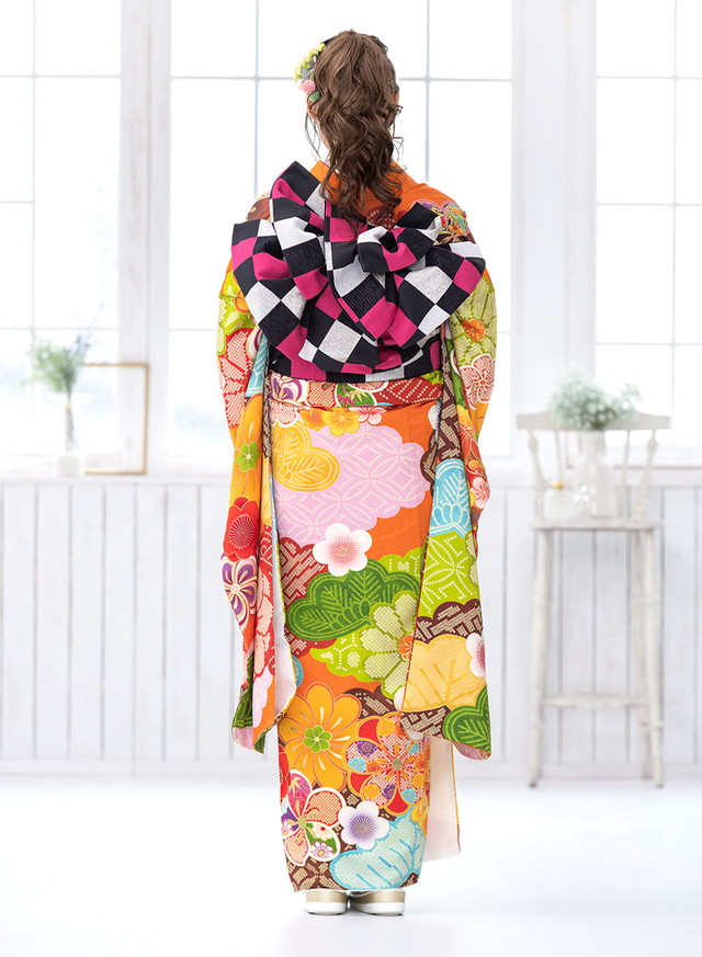 振袖セット 振袖購入 成人式 販売 日本製 7点セット 絵羽柄 橙色 黄色 桜 鹿の子 丹後ちりめん 正絹 京友禅 西陣織 送料無料