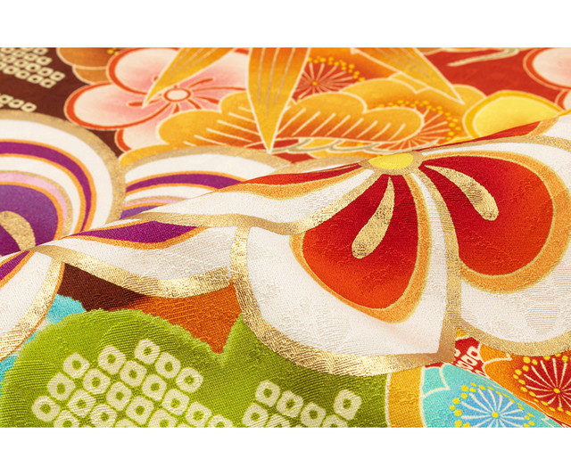 振袖は、梅紗綾型の織柄の丹後ちりめんの正絹生地に、梅や桜などの花々や雲取りなどが京友禅で染め付けされた豪華な絵羽模様です。撥水効果のある「パールトーン」加工も施されています。