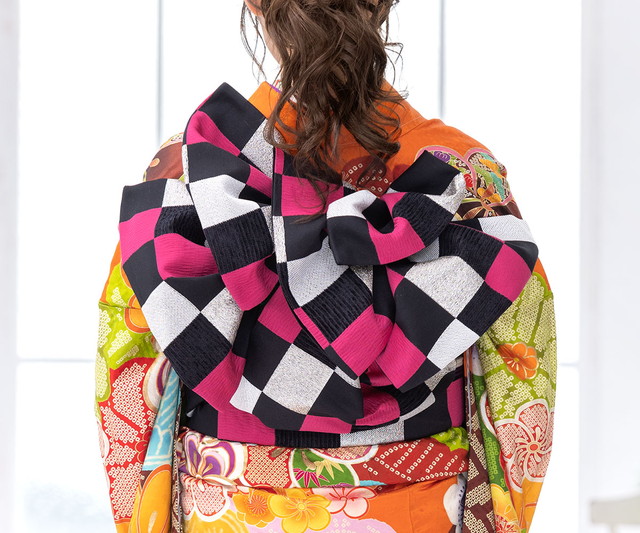 六通柄の袋帯は西陣織『西陣志美津』謹製で、輝く金色糸を織り込んだ市松格子の意匠です。