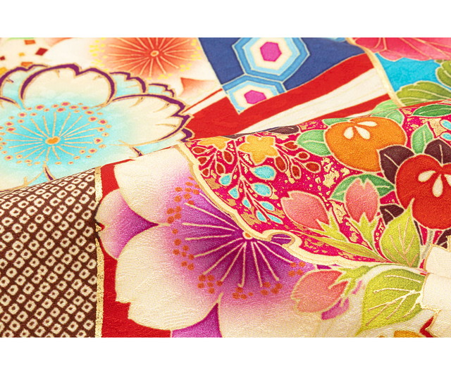 振袖は、梅紗綾型の織柄の丹後ちりめんの正絹生地に、桜や菊、牡丹などの花々や鹿の子などが配された短冊が京友禅で染め付けされた豪華な絵羽模様です。撥水効果のある「パールトーン」加工も施されています。