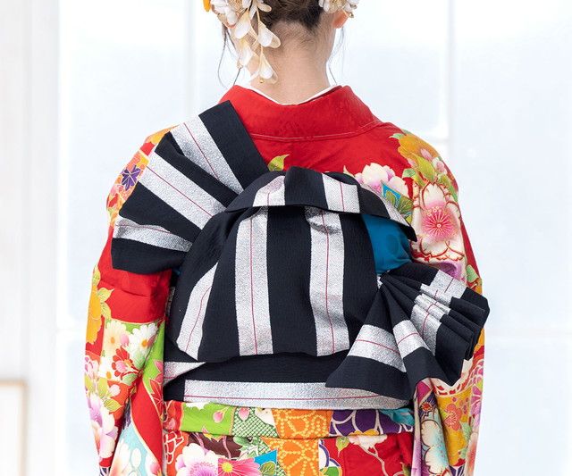 六通柄の袋帯は西陣織『西陣志美津』謹製で、輝く銀色糸を織り込んだ縞の意匠です。
