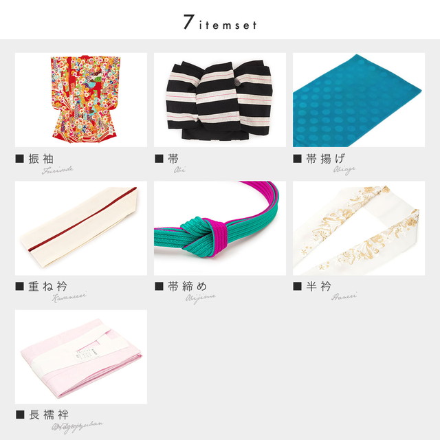 内容は【振袖・帯・帯揚げ・伊達衿(重ね衿)・帯締め・半衿・長襦袢】の7点セットです。