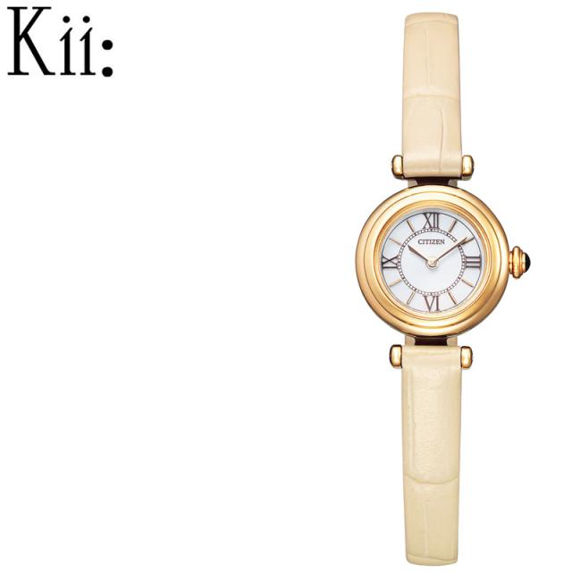 | シチズンは1918年に創業し、グローバルに展開しているウオッチブランドです。シチズンという名前には「市民に愛され親しまれるモノづくり」という想いが込められています。私たちにとって「市民」とは、自由な精神のもとに改革を推し進める文化の担い手であり、日々挑戦し、変化を起こし続ける人たちです。一方、私たちシチズンは部品から完成時計まで自社一貫製造するマニュファクチュールであり、だからこそ可能な「改善」を積み重ねることで、時計の未来を創り出す使命があると考えています。常に未来を想像し、昨日達成したことの改善点を今日見つける。BetterStartsNow。私たち一人ひとりの目の前にある「今」こそが、世界をより良くするためのスタートのときであるという信念のもと、これからも私たちは現在に留まることなく、より多くのお客様に、より良い時計を身につけていただけるように未来への挑戦を続けていきます。 アンティークデザインのエコ・ドライブアクセサリーウオッチ、シチズン Kii: (キー)。シックで華奢な佇まいが魅力の新型ラウンドモデルが登場。年齢を問わず、長い愛着に応えるオーセンティックな1本です。・ころんとした可愛いフォルム、華奢な印象のラウンド型ケース。飾りピンに見立てたアクセントパーツがシックでアンティークな印象を演出します。・インデックスはクラシカルでマニッシュな印象のローマ字フォントを採用し、秒単位で時間が確認できるレール切分をプリント。小さめの文字板でありながらも見やすく、おしゃれ感のあるデザインです。・風合いのあるカーフ革バンド。裏地のカラーリングにもこだわり、細部までおしゃれ感を追求しています。長くご愛用いただけるよう、市販の革バンドへの付け替えも可能です。
