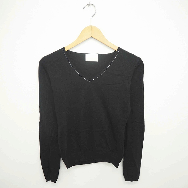 【中古】ナチュラルビューティー ニット セーター Vネック ビーズ装飾 綿 コットン アンゴラ混 長袖 M 黒 ブラック