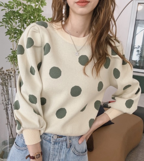 トップス セーター おしゃれ カジュアル シンプル ゆったり 白 黒 オレンジ ニット ドット柄 水玉模様 ラウンドネック 九分袖 バルーン袖 秋冬 大人可愛い 10代 20代 30代 お出かけ デート 着まわし トレンド