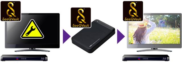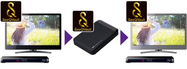 従来の録画方法では映像コンテンツ保護のため、別のテレビやレコーダーで再生することができませんでしたが、SeeQVault(TM)対応のハードディスクなら録画した番組を別のテレビやレコーダーに変えても、引き継いで視聴することができます。