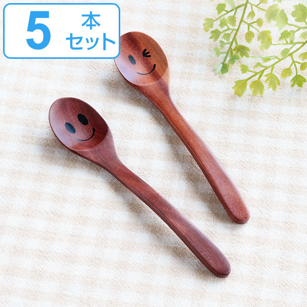 スプーン 14cm デザートスプーン ニコニコ&ウィンク 木製 サオ 籐芸 同柄5本セット ( ティースプーン スマイル ニコちゃん 顔 カトラリー コーヒースプーン 木 おしゃれ かわいい カフェ風 洋食器 木製食器 )