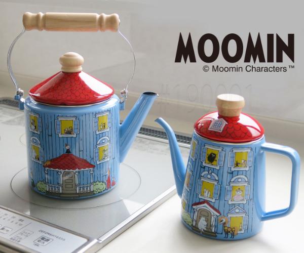 ムーミンハウスデザインの可愛らしいホーローケトルです。ムーミンキャラが勢ぞろいしています。焼き物の風合いと鉄の堅牢さをそなえ、ムーミンの世界観とマッチしています。