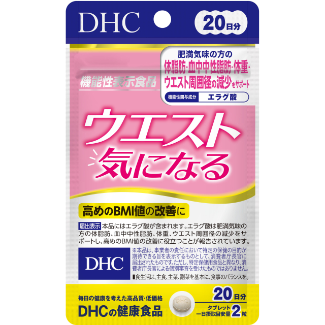 「ウエスト気になる」は、機能性関与成分エラグ酸を1日あたり3mg配合した機能性表示食品です。肥満気味の方の体脂肪、血中中性脂肪、体重、ウエスト周囲径の減少をサポートし、高めのBMI値の改善に役立つことが報告されています。