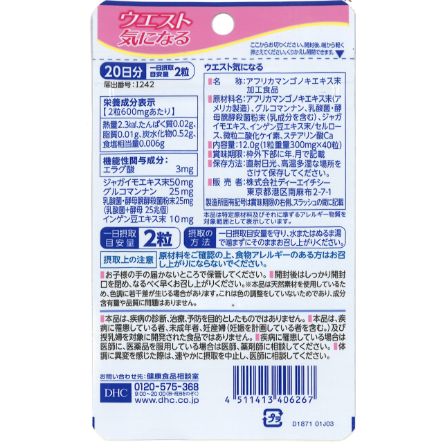 商品名 ディーエイチシー(DHC) ウエスト気になる 20日分 40粒【機能性表示食品】 容量 20日分 40粒 原材料名 アフリカマンゴノキエキス末(アメリカ製造)、グルコマンナン、乳酸菌・酵母醗酵殺菌粉末(乳成分を含む)、ジャガイモエキス、インゲン豆エキス末/セルロース、微粒二酸化ケイ素、ステアリン酸Ca アレルギー特定原材料 乳成分 生産国 日本 賞味期限 商品の発送時点で、360日以上あるものをお届けいたします 保存方法 直射日光、高温多湿な場所を避けて保存してください。 一日摂取目安量 2粒 摂取の方法 一日摂取量を守り、水またはぬるま湯で噛まずにそのままお召し上がりください。 届出番号 I242 届出表示 本品にはエラグ酸が含まれます。エラグ酸は肥満気味の方の体脂肪、血中中性脂肪、体重、ウエスト周囲径の減少をサポートし、高めのBMI値の改善に役立つことが報告されています。 その他 食生活は、主食、主菜、副菜を基本に、食事のバランスを。