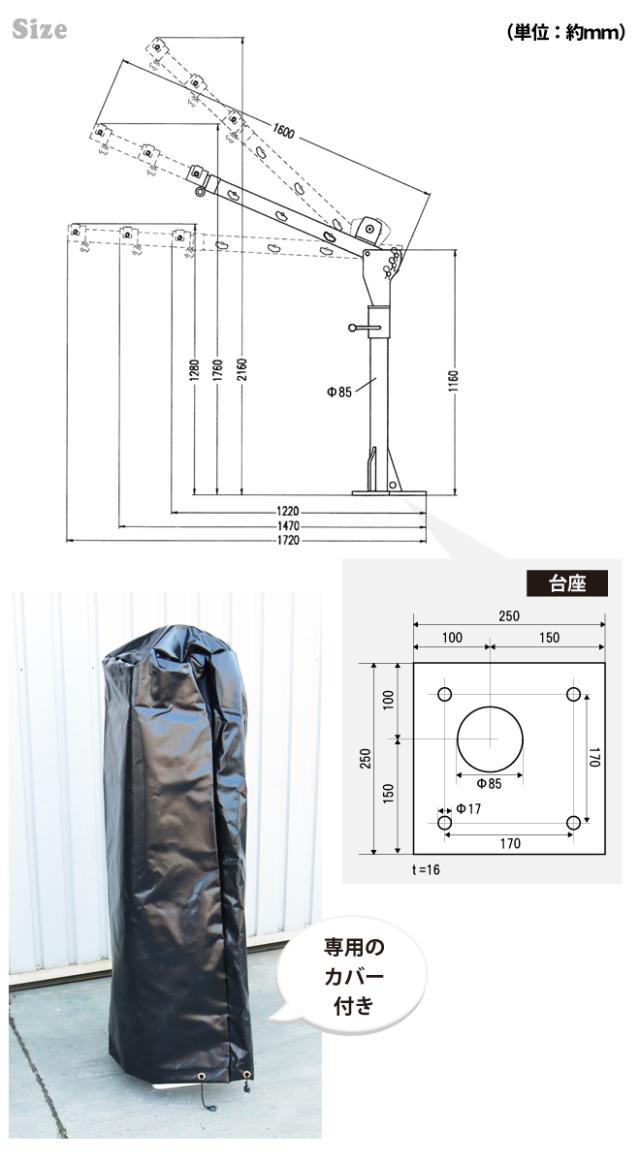 | ブーム伸縮時/最大能力 | ・1100mm/400kg(ダブルフック時) ・1350mm/250kg ・1600mm/100kg |