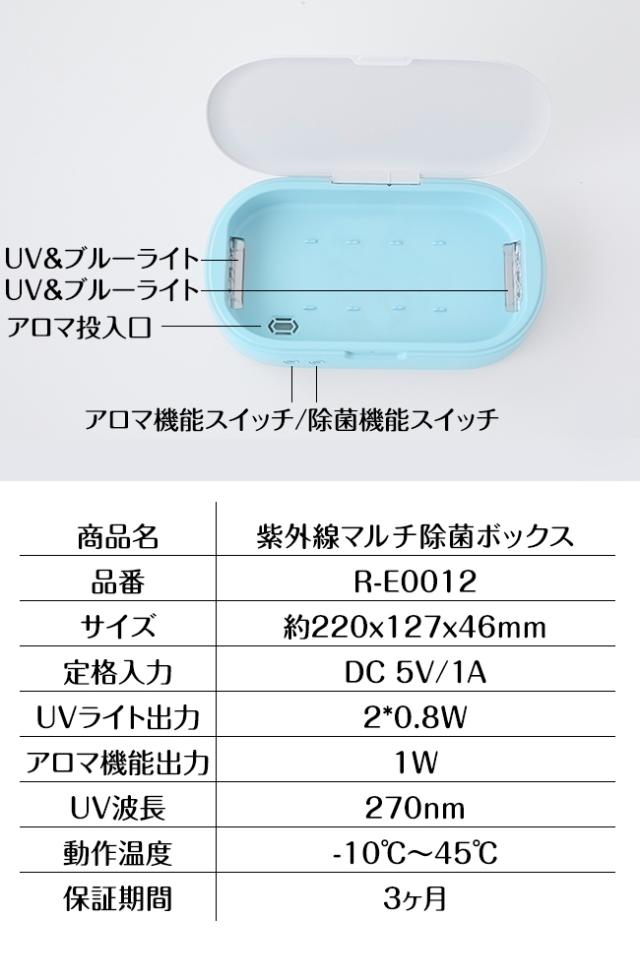 製品仕様●品番:R-E0012 ●サイズ:約220 * 127 * 46mm●入力電圧:DC / 5V●UV波長:270〜280nm●出力:2 * 0.8W●入力:1W<生産国>中国※日本で企画し、中国で生産したものです。 ご注意 1.ご使用前に必ずこの取扱説明書をよくお読みいただき、正しくお使いください。2.強い紫外線であるUV- Cライトの光を直接目で見たり、皮膚にあてると人体に悪影響を及ぼす場合があります。 ライトの光を直視したり、皮膚にあてたりしないでください。3.子供の手の届くところで使用したり、保管しないでください。4.水につけたり、浴室や湿気の多い場所で使用しないでください。 感電・ショート・火災の原因になる恐れがあります。5.本製品を改造・分解しないでください。感電やケガをする恐れがあります。6.本来の用途以外には使用しないでください。
