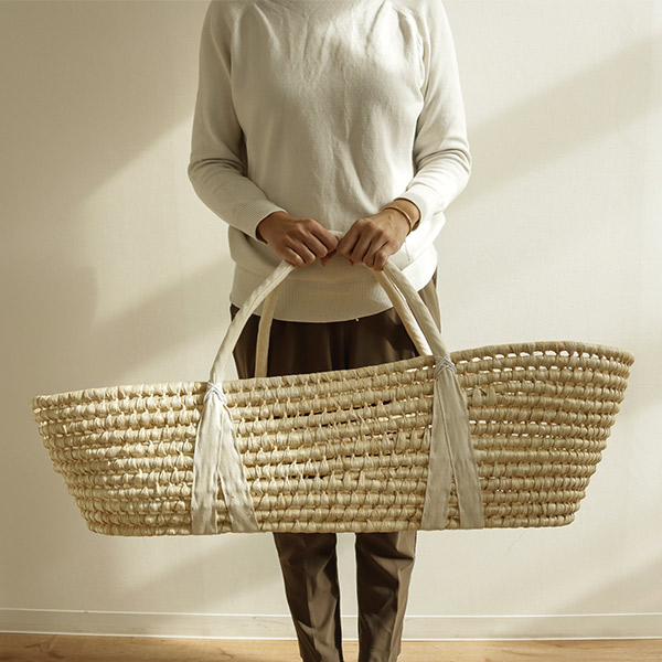通気性の良い天然素材メイズ(トウモロコシの皮)を編みあげたクーファンです。もこもことした見た目で可愛いらしく、柔らかくて通気性の良い素材は、赤ちゃんをやさしく包み込みます。産院から退院する時や検診に行く時、里帰りする時や外気浴する時の外出の際に重宝します。シンプルでナチュラルなクーファンは、お好みの布などで自由にアレンジしていただけます。