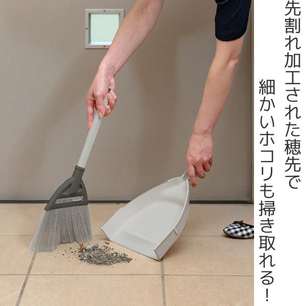 先割れ加工の穂だから細かいホコリもしっかりと掃き取れます。ちりとりには、穂に付いたゴミを取るギザギザ加工が施されています。