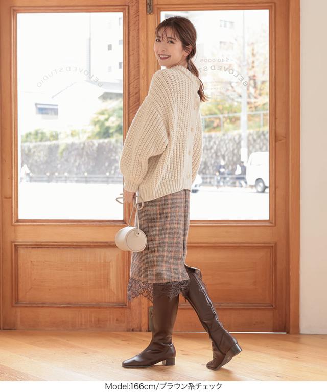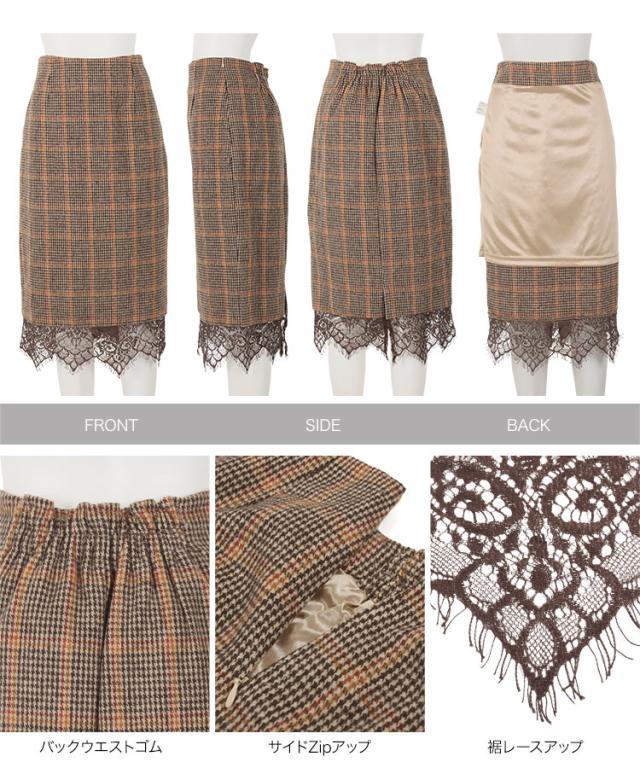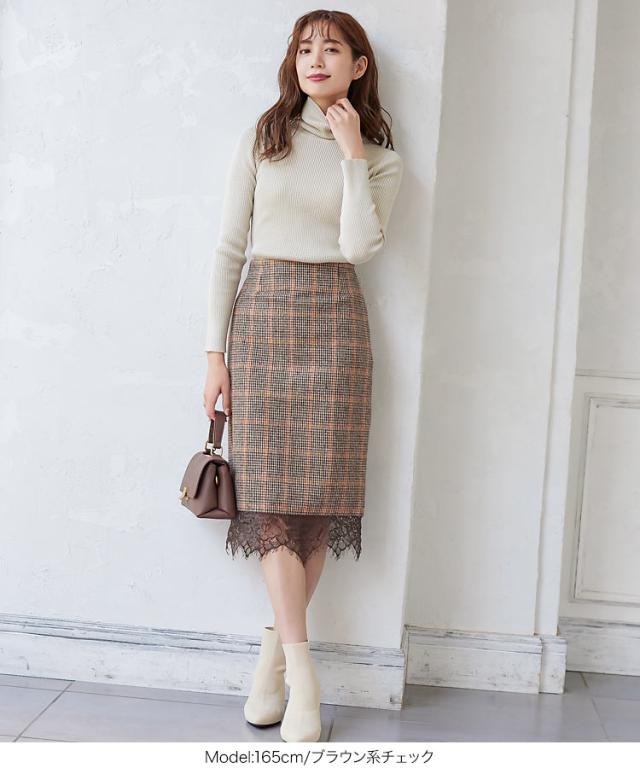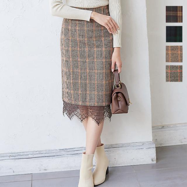 春新作 バックウエストゴム裾レースチェック柄タイトスカート M3144 入荷済 レディース 秋冬 上品 ハイウエスト 起毛 あったか スカート タイトスカート 秋 冬 ミモレ丈 チェック レース おしゃれ きれいめ 大人可愛い チェックスカート 裏地あり 40代 50代