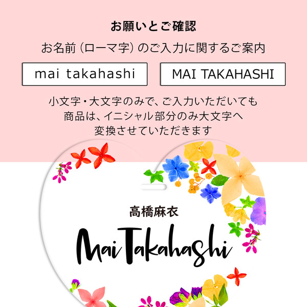 商品をかごに入れてご注文を進めて頂き、確定前に出てくる「お店へのご要望(その他ご希望など)」欄にご希望のお名前を漢字とローマ字でそれぞれ入力して下さい。