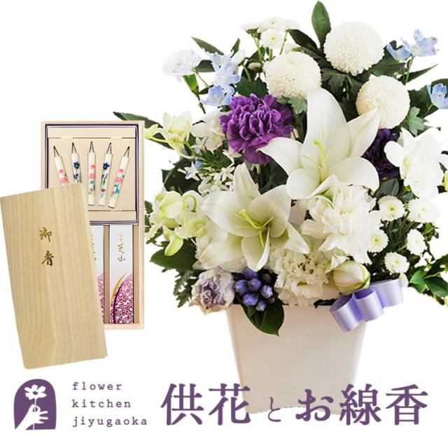 お供え 花 お線香と花のセット 洋花を使った ユリのお供えアレンジMサイズ と 日本香堂「芝山」絵ろうそく+お線香 ご進物用ギフトセット メッセージカード FKAA