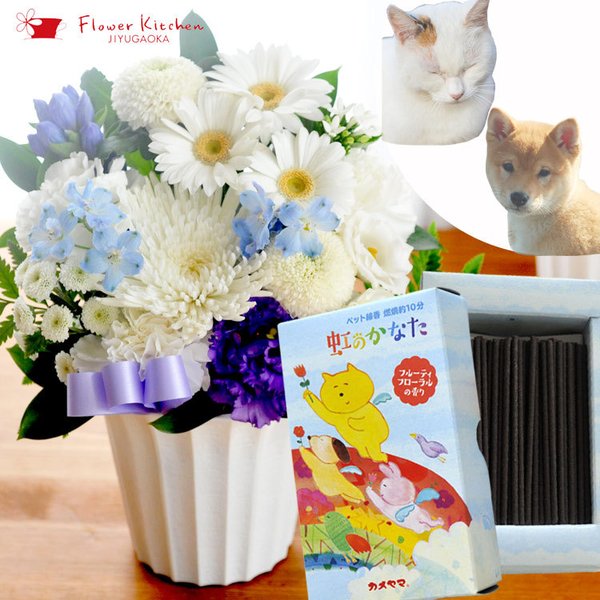 ペットのお供え 弔事 ローソクと花のセット 旬のお供えアレンジSサイズとペット専用お線香【虹のかなた】ギフトセット メッセージカード FKAA