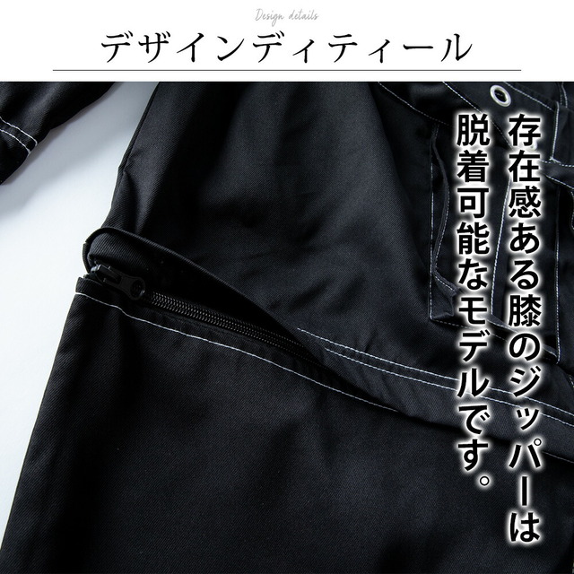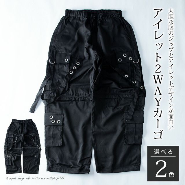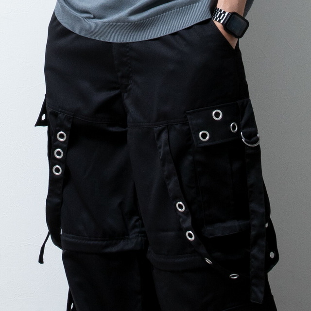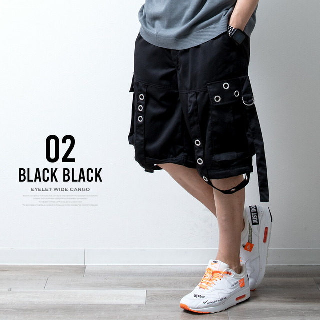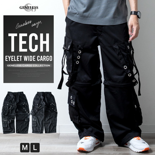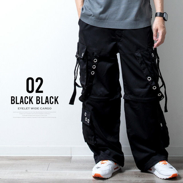カーゴパンツ メンズ ワイド テック ワイドパンツ アイレット付き 2WAY ゴムウエスト 着脱可能 ゆったり 家庭洗濯 パンツ ミリタリー ブラック×ブラック 太め