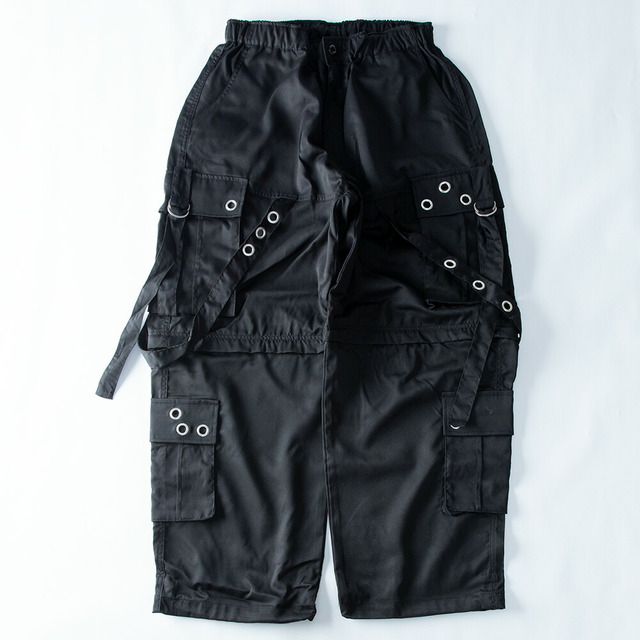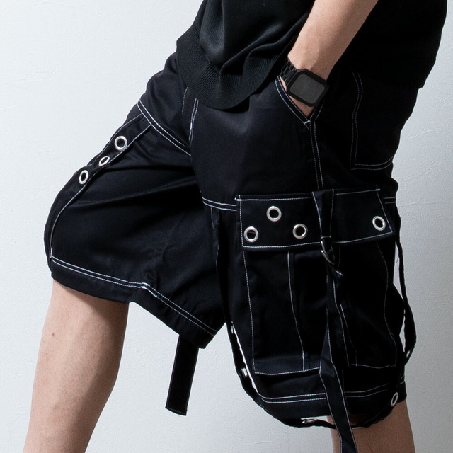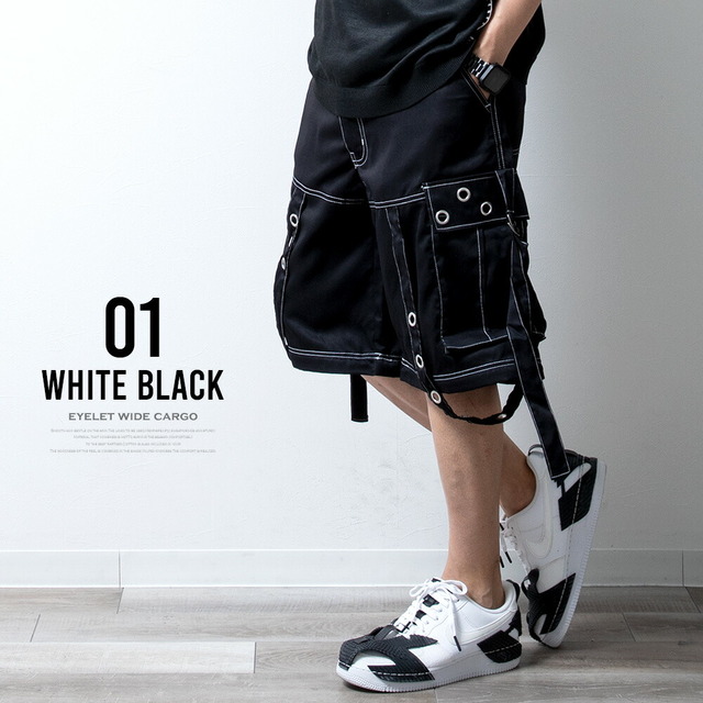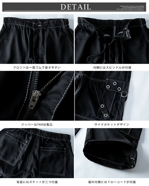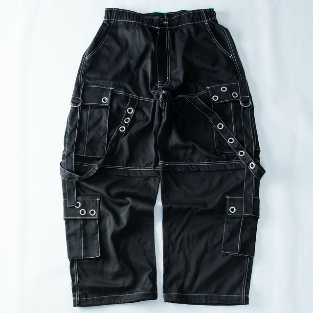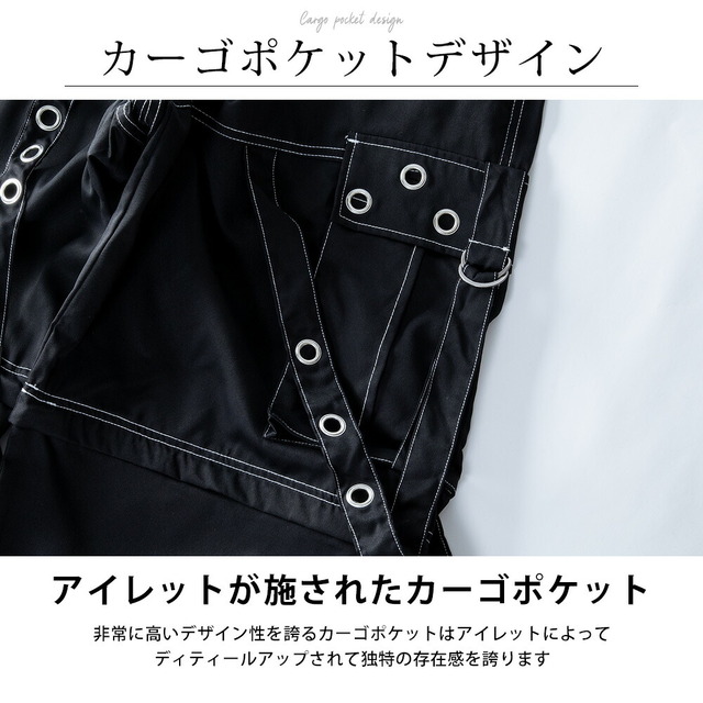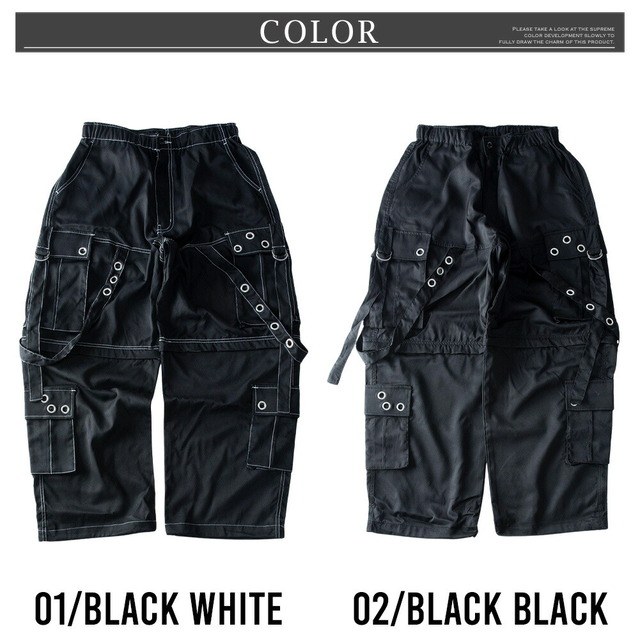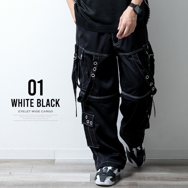 カーゴパンツ メンズ ワイド テック ワイドパンツ アイレット付き 2WAY ゴムウエスト 着脱可能 ゆったり 家庭洗濯 パンツ ミリタリー ブラック×ブラック 太め シンプル 無地 秋 ブラック×ホワイト 秋冬 全2色 ブラック ボトム ズボン