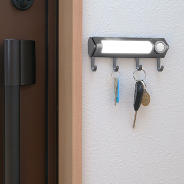 乾電池式の多機能なキーフックLEDライトです。フックが4つ付いているので、ちょっとした鍵や小物を掛けるのに便利です。その他にも様々な機能が付いており、玄関周りはもちろんのこと、倉庫やクローゼット等様々な場所にご使用頂けます。