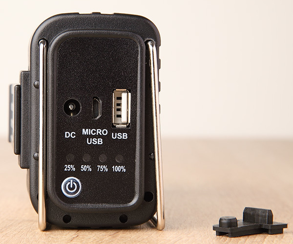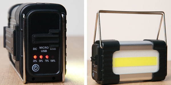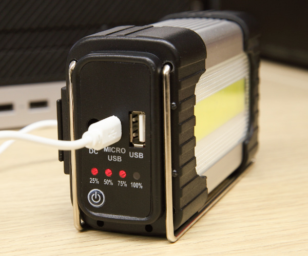 電源の無い所で大活躍のポータブルバッテリーLEDライトです。マイクロUSBポートに付属の充電用USBケーブルのMICRO USBコネクタを差し込み、対応外部電源機器に接続すると、電池残量が点滅し充電を開始します。(充電時間約8、5時間)充電完了後はLEDライトとしてのご利用、スマートフォンや各種充電や電源としてご使用して頂くことが出来ます。電源のないキャンプ、野外フェス、アウトドア等で大活躍します。(防水加工は施されておりません。)