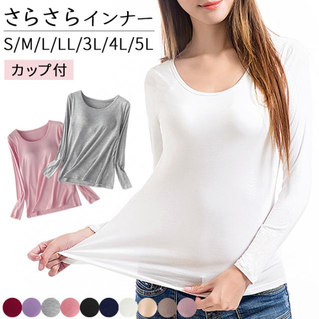 長袖 カップ付き インナー パッド付き プラトップ 大きいサイズ レディース 肌着 丸首 無地 さらさら 薄手 アンダーゴム 黒 白 赤 紺 紫 S M L LL 3L 4L 5L rr66