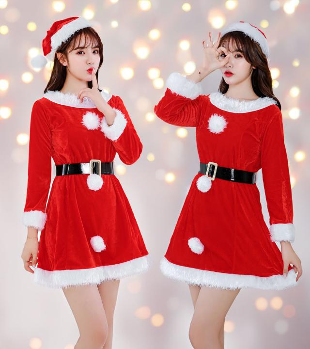 コスプレ サンタ コスプレ レディース サンタコスチューム クリスマス コスプレ クリスマス衣装 サンタ衣装 イベント衣装 クリスマスプレゼント 帽子,ワンピース,ベルトの3点セットふわふわのポンポン飾りサンタミニドレス サンタ衣装