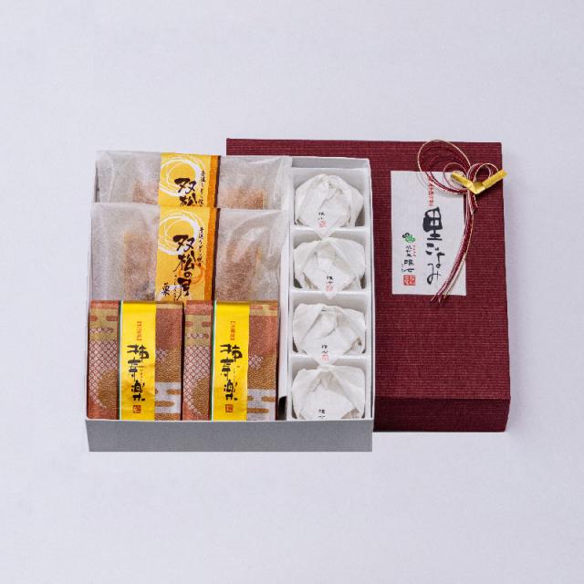 双松庵唯七の看板商品「柿寿楽」と、秋冬の人気商品「双松の月(栗)」「栗きんとん」の三種詰合せです。
