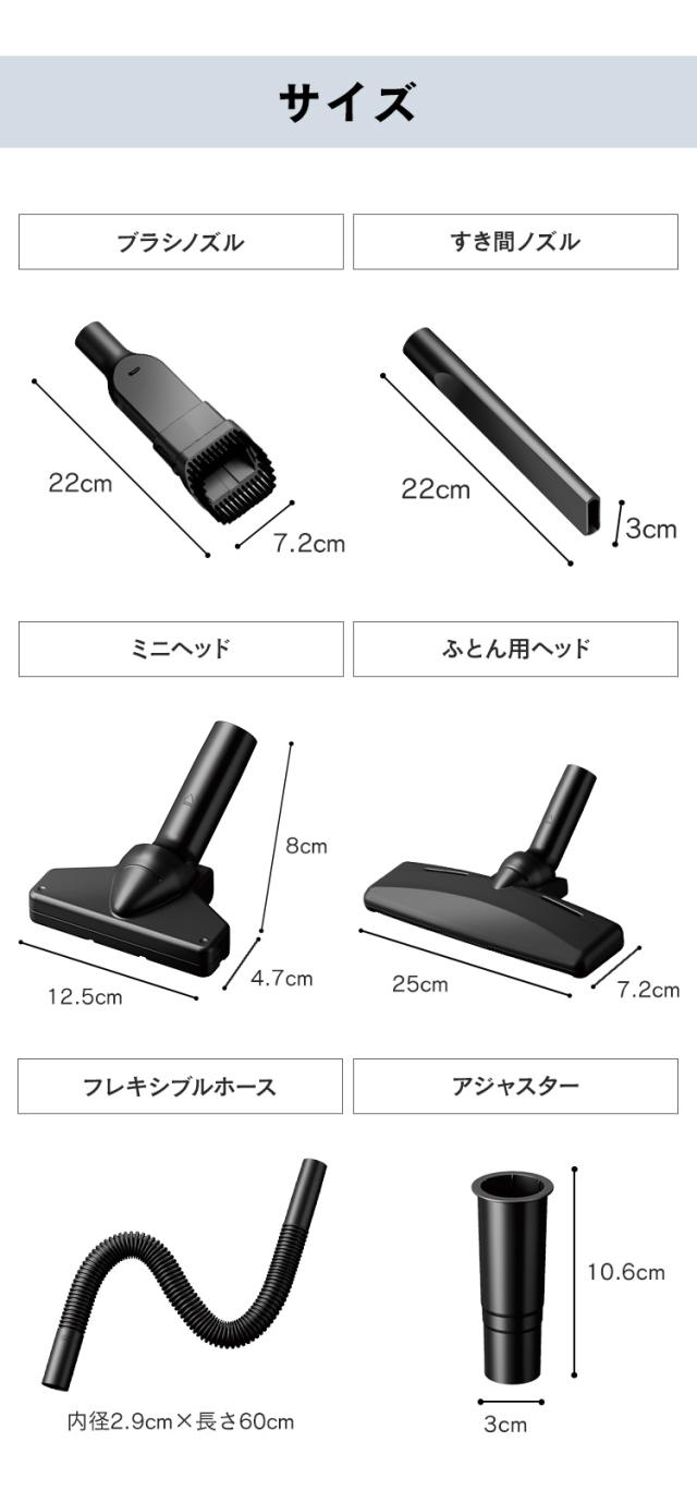 すき間ノズル、ブラシノズル、ミニヘッド、布団用ヘッド、フレキシブルホース