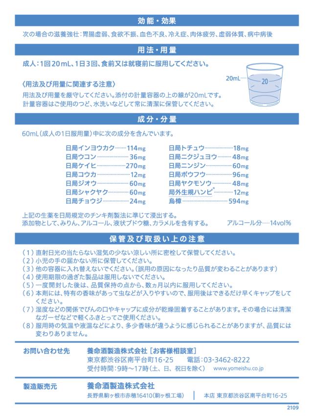 商品名 第2類医薬品 薬用養命酒 1000mL 2個セット 容量 1L × 2個セット:合計2L メーカー 養命酒製造 カテゴリー 医療・介護・医薬品>医薬品>滋養強壮剤・ドリンク>滋養強壮剤・ドリンク【第一・二類医薬品(指定第二医薬品含む)】 効果・効能 胃腸虚弱 、食欲不振、血色不良、冷え症、肉体疲労、虚弱体質、病中病後 用法・用量 成人:1回20mL、1日3回、