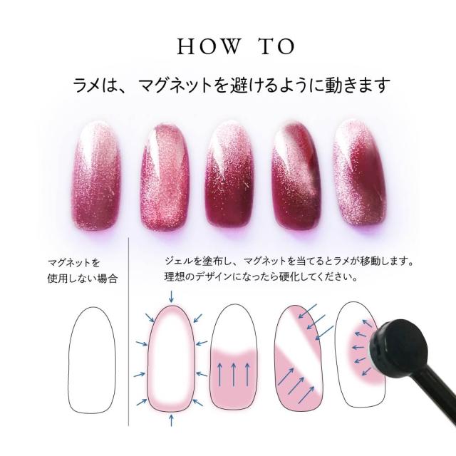 | 使用方法 | キャッツアイネイルのやり方 1.ベースジェルを塗布し硬化します。 2.キャッツアイジェルを塗布し専用磁石を当てお好みのデザインが出来たら硬化します。 3.仕上げにトップコートを塗布し硬化します。 ※未硬化ジェルの出る取っ富コートの場合はふき取りが必要となります。 (2.の前にベースカラーまたはキャッツアイジェルを塗布し硬化するとさらに色味が増します。) |