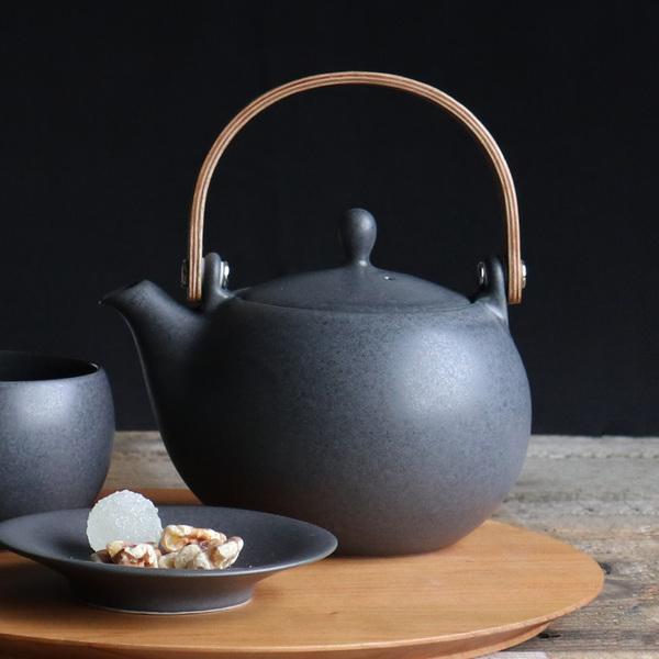 4〜5人分のお茶を淹れるのにちょうど良い、ファミリーサイズの土瓶急須です。マットな質感の釉薬と、曲げ木の持ち手との組み合わせが新鮮です。普段使いしやすく、日常にしっくりと馴染むシンプルなデザインです。