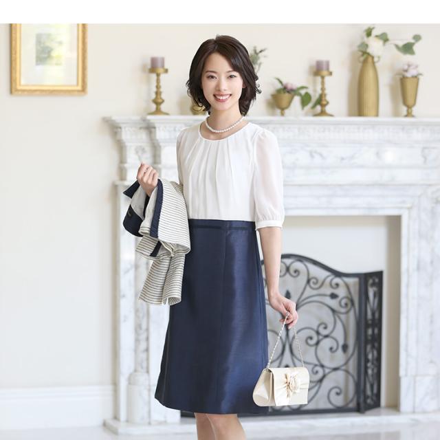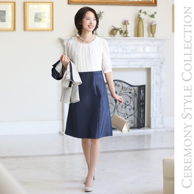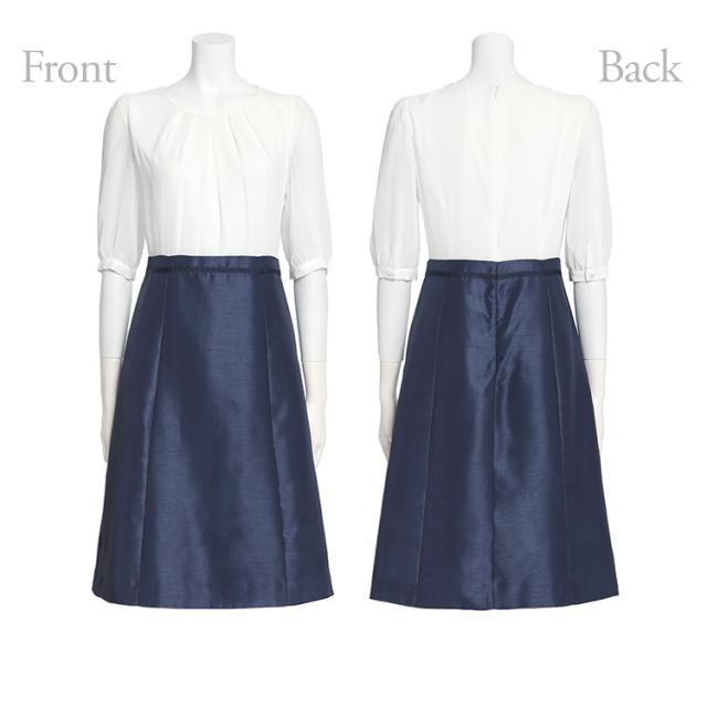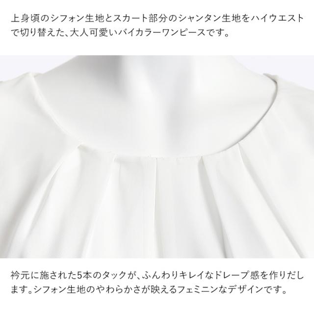 ・上身頃のシフォン生地とスカート部分のシャンタン生地をハイウエストで切り替えた、大人可愛いバイカラーワンピースです。