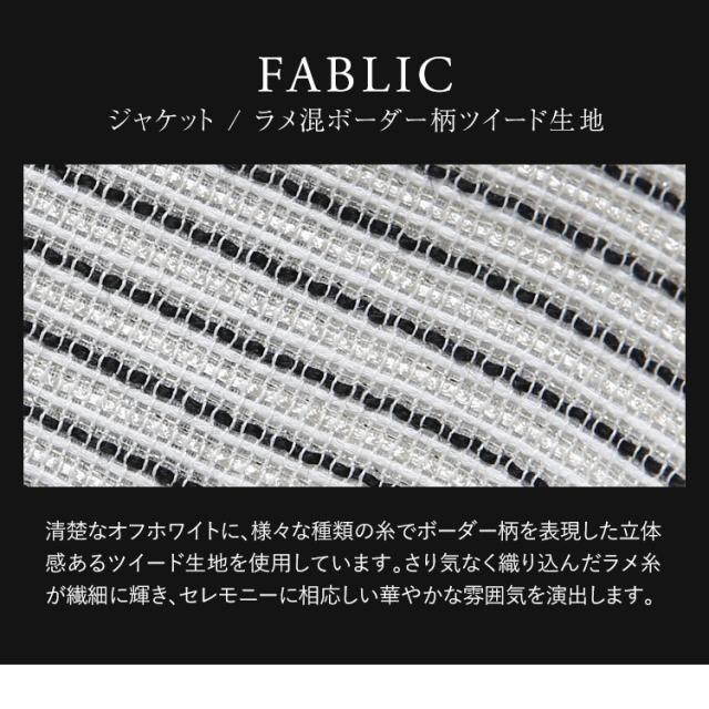 ・清楚なオフホワイトに、様々な種類の糸でボーダー柄を表現した立体感あるツイード生地を使用しています。さり気なく織り込んだラメ糸が繊細に輝き、セレモニーに相応しい華やかな雰囲気を演出します。
