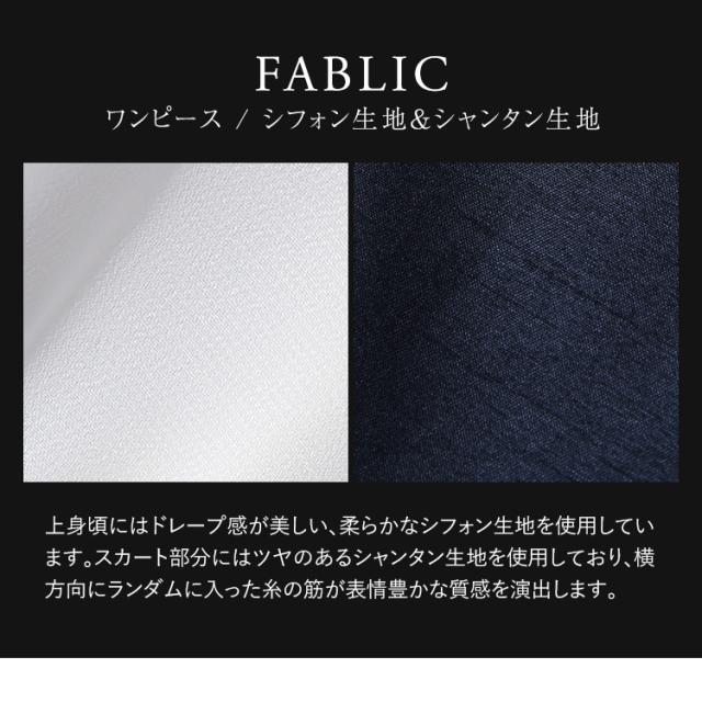 ・上身頃にはドレープ感が美しい、柔らかなシフォン生地を使用しています。スカート部分にはツヤのあるシャンタン生地を使用しており、横方向にランダムに入った糸の筋が表情豊かな質感を演出します。