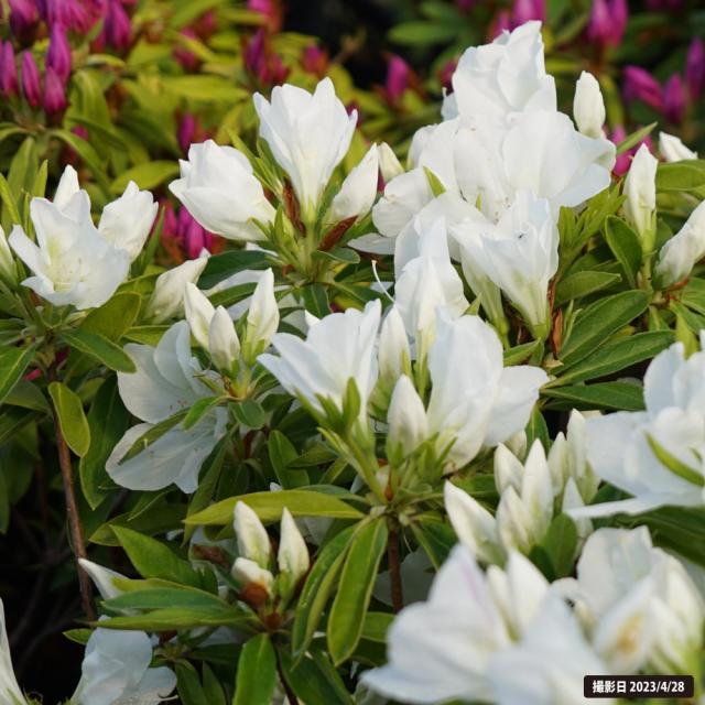 長崎県の平戸で江戸時代から育成されてきた大輪ツツジで、白花大輪の一重の花を咲かせます。花弁は丸みがあり可愛いです。枝は直立性で樹勢は旺盛。