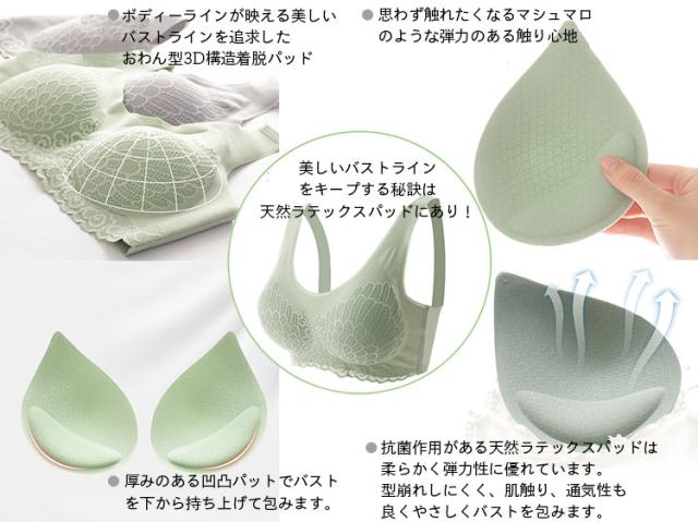 ●抗菌作用のある天然ラテックスパッドは通気性がよく厚みのある凹凸で、バストを下から持ち上げてやさしく包み、垂れ乳を防止します。